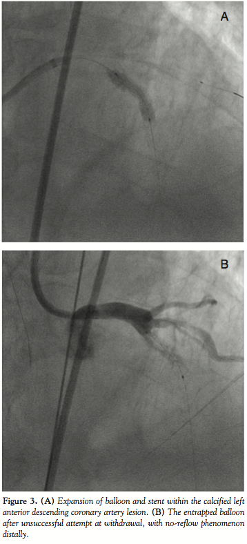 ABSTRACT: Balloon entrapment during coronary angioplasty is a rare but potentially disastrous complication of percutaneous coronary intervention (PCI), described during both angioplasty alone, as well as with stents. This report describes the case of an entrapped stent-balloon within an extremely calcified proximal left anterior descending artery (LAD) lesion, and reviews techniques and strategies that can be applied in similar situations. In this case, we suspect the open-cell design of the specific stent used, combined with the high radial force of the calcified lesion, led to a “pincer effect,” and entanglement of the balloon material within the stent scaffolding. After exhaustion of all percutaneous options to retrieve the balloon, the patient was ultimately taken for urgent cardiac surgery for extraction of the balloon and vein patch of the LAD.