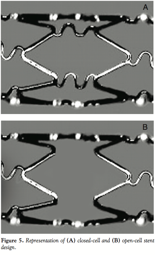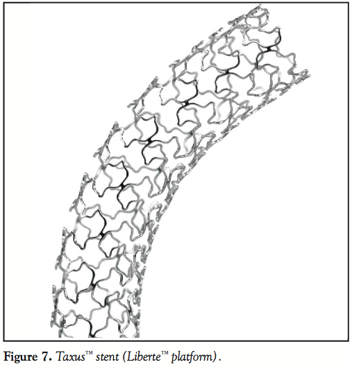 Early stents, such as the Cook Gianturco-Roubin™ and the Medtronic Wiktor™, were very flexible, but lack of longitudinal struts lead to poor radial strength.12 This led to development of today’s tubular stents, with longitudinal struts adjoined in different lengths and geometric patterns, adding significant radial strength while sacrificing flexibility. A related element is “open” versus “closed-cell” design, with the latter having longitudinal connections along the entirety of the stent, and the former employing areas without longitudinal struts. Open-cell stents tend to be more flexible and deliverable, and significantly change cell conformation with expansion.13 Closed-cell designs boast higher radial strength, maximum drug delivery, and better intimal coverage. Stents currently available have different ratios of each (Figures 5A and 5B). Contemporary drug-eluting stents include Taxus (which uses the Express and Liberte stent platforms), Cypher (Bx Velocity stent platform), Xience V™ (Vision™ stent platform; Abbott Vascular), and Endeavor™ (Driver™ stent platform; Medtronic, Minneapolis, Minnesota).14 Of these designs, the Bx Velocity platform has the most complete closed-cell design (Figure 6), compared with the Liberte platform (Figure 7).4,5