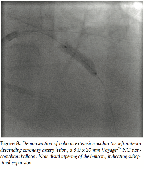 Of course, the extensive calcification in this particular case placed the patient at higher risk for complications overall; in fact, calcification of a lesion has been shown to be one of the most significant predictors of procedural failure in PCI.17 Retrospectively, perhaps more consideration could have been given to planned CABG, or the use of adjunctive techniques such as rotational atherectomy. Though the latter has fallen out of favor in recent years as a stand-alone technique, many reports have shown high procedural success when used for debulking of plaque prior to stenting (the so called Rota-stent technique) in heavily calcified lesions, achieving an impressive 89–98% procedural success.18 It also may be of particular utility for lesions in which the PCI balloon does not fully expand.19On careful review of the predilation image, this occurred to some extent at the distal tip of our balloon (Figure 8).