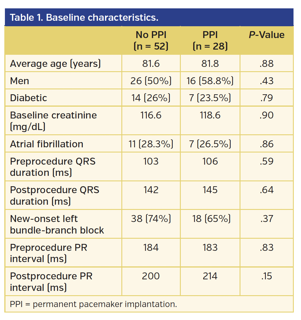 There were no differences in QRS duration between the two groups before or after TAVI (106 ms in the PPI group vs 103 ms in the no-PPI group [P=.59] and 145 ms in the PPI group vs 142 ms in the no-PPI group [P=.64]), respectively, and no difference in the incidence of new left bundle-branch block (65% in the PPI group vs 74% in the no-PPI group; P=.37).
