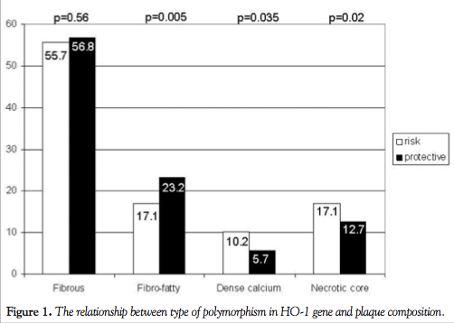 The polymorphism of HO-1 gene. The risk type of polymorphism in the HO-1 gene was found more frequently in patients with a history of MI (61.3% vs 32%; P=.0097) and in patients with diabetes (68.4% vs 35.5%; P=.011). In addition, patients with the high-risk type of polymorphism in the HO-1 gene had a higher FRS (21.5 ± 12.5 vs 15.7 ± 8.0; P=.014), higher angio score (9.1 ± 4.2 vs 6.9 ± 3.1; P=.008), and also a higher PAV (results are mentioned above) than patients with the protective type of polymorphism in the HO-1 gene. The relationship between the specific type of HO-1 polymorphism and the plaque composition is shown in Figure 1.