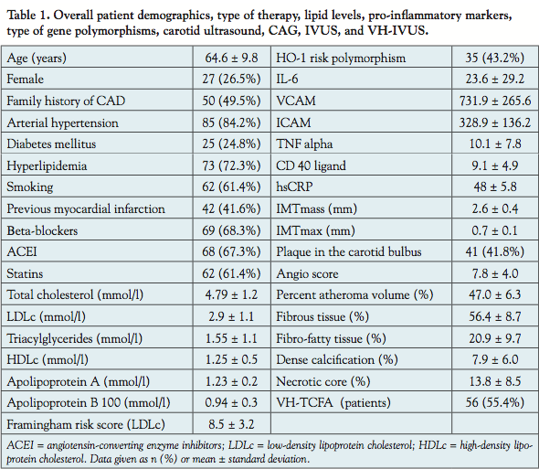 Study limitations. A limitation of the present study is the relatively small number of patients enrolled, especially considering the assessment of possible correlation between the atherosclerotic risk factors and plaque composition. Additionally, only 80.2% of patients underwent genetic analysis; however, the study sample size is sufficient to generate statistically significant results and thus allow initial conclusions to be drawn. Finally, the study allowed detailed VH-IVUS assessment of only one plaque in a single coronary artery per subject.