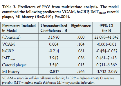 Prediction of PAV. Higher levels of PAV were found in patients with a risk type of HO-1 polymorphism (48.6 ± 6.6% vs 45.8 ± 5.8%; P=.04) and in patients with plaque in the carotid bulb (48.6 ± 5.7% vs 44.7 ± 6.8%; P=.008). PAV correlated with IMTmass (P=.05; r = 0.22). Predictors of PAV from multivariate analyses are summarized in Table 3.