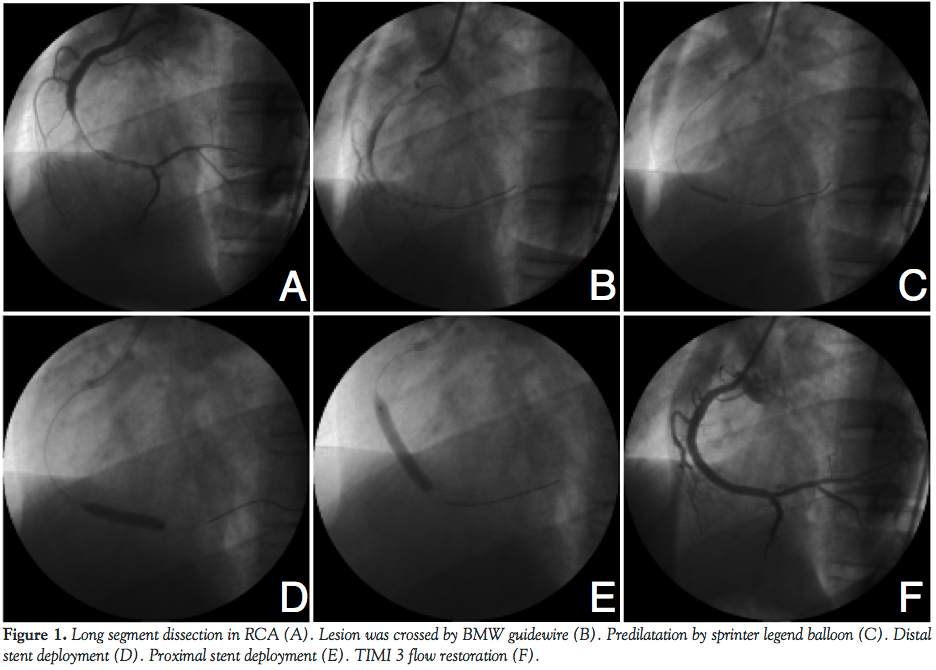 His electrocardiogram revealed ST elevation in leads II, III, and avf. He was treated with intravenous nitrates, aspirin, clopidogrel, beta-blocker, and atorvastatin. After receiving eptifibatide, he was transferred for coronary angiography and subsequent intervention. Cardiac catheterization revealed a long dissection in the right coronary artery (RCA) from mid segment to the distal part with thrombus. The other coronary arteries were normal. The left ventricle had akinesia in the infero-posterior segments. The ejection fraction was 35%. RCA ostium was engaged with right Judkins 3.5 7 Fr guide catheter. The area of dissection was crossed with a BMW guidewire with difficulty. Aspiration catheter did not cross. A 2 mm x 10 mm balloon (Sprinter Legend, Medtronic) was placed into the distal portion of the RCA and inflated sequentially to prepare the bed. Two endeavor resolute stents (3.5 mm x 24 mm, 4.0 mm x 30 mm) were deployed at 16 atm across the lesion. Both the stents were post-dilated. TIMI III flow restored with resolution of the ST segment elevations, and abolishment of chest pain. Intracoronary adenosine and nicorandil were given beforehand.