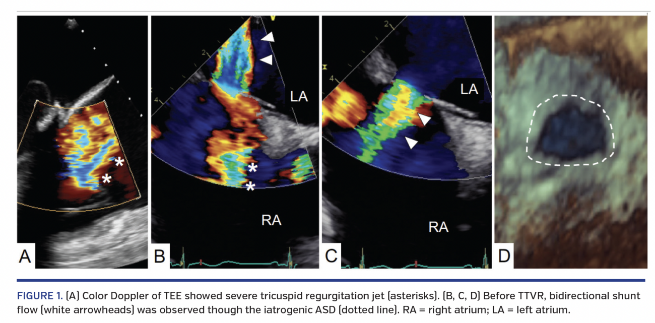 A 73-year-old woman who had undergone transcatheter mitral valve repair (TMVR) and surgical valve replacement for mitral regurgitation due to short-term failure of the MitraClip presented with dyspnea (New York Heart Association class III). Transesophageal echocardiography (TEE) revealed severe tricuspid regurgitation (TR) (Figure 1A) and bidirectional shunt flow through a residual iatrogenic atrial septal defect (ASD) (Figures 1B-1D; Video 1), which was not evident at the surgery. Estimated systolic pulmonary arterial pressure (SPAP) was 48 mm Hg. The heart team planned a transcatheter tricuspid valve repair (TTVR) using the MitraClip XTR system (Abbott Vascular).