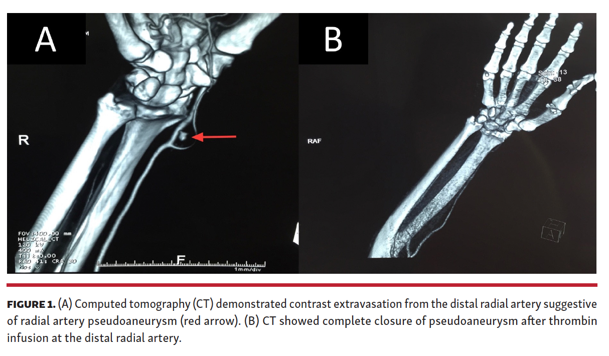 A 53-year-old male patient presented with 2-month history of small, painless, non-progressive swelling at the right wrist. He had undergone transradial primary percutaneous coronary intervention to the right coronary artery 3 months prior. A 6 Fr radial sheath was inserted after 2 puncture attempts. He was administered a glycoprotein IIb/IIIa inhibitor, tirofiban, for the thrombotic occlusion of the right coronary artery and discharged on aspirin 150 mg, clopidogrel 75 mg, rosuvastatin 40 mg, and a beta-blocker. On examination, small, painless, pulsatile swelling was present at the right wrist. A possibility of radial artery pseudoaneurysm was confirmed on computed tomography scan, which revealed a pseudoaneurysm emanating from the right radial artery (Figure 1A). After failed manual and ultrasound-guided compression, thrombin was injected under ultrasound guidance, resulting in complete resolution and palpable radial artery up to 6-month follow-up (Figure 1B).