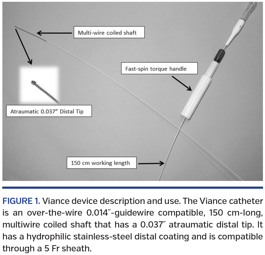 Viance catheter for infrapopliteal CTOs: design, tips, and techniques. In contrast to the devices described above, the Viance catheter is an over-the-wire 0.014˝-guidewire compatible, 150 cm-long, multiwire coiled shaft that has a 0.037˝ atraumatic distal tip. It has a hydrophilic stainless-steel distal coating and is compatible through a 5 Fr sheath. It is designed to deliver a guidewire via true lumen or subintimal pathways.