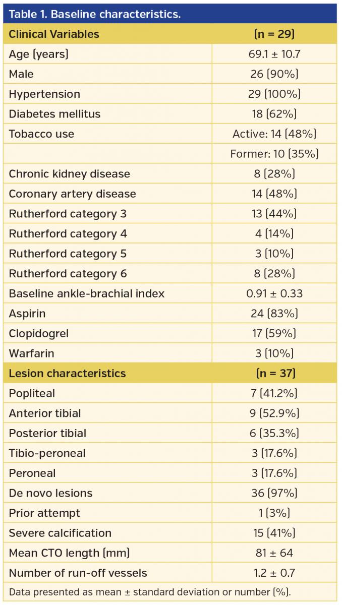 The anatomical challenges associated with BTK disease treatment include the frequent presence of vascular calcification, a high prevalence of chronic total occlusions (CTOs), and diffuse atherosclerosis. CTOs in particular are present in as many as 40% of patients presenting with CLI. The presence of a CTO has been associated with a lower procedural success rate with endovascular therapy, as well as increased procedural times, radiation dose, and contrast load.2 Failure to cross the occlusion is the primary method of failure in the majority of unsuccessful cases.2 The use of a wire coupled with a support catheter has been documented to cross infrainguinal CTOs in 40%-60% of cases.3 With the advent of subintimal passage and reentry with hydrophilic guidewires, the success rates have increased to over 80% (although this statistic is largely limited to above-the-knee occlusions).4,5 Success rates for infrapopliteal vessels are lower, with treatment failure occurring in about 25% of lesions <15 cm long and a failure rate of ~46% for occlusions ≥15 cm long.6 Subintimal tracking and reentry remain challenging in BTK arteries due to smaller vessel size. These factors are the rationale for developing novel peripheral CTO crossing catheters. We present a multicenter experience with the Viance (Covidien) and CrossBoss (Boston Scientific) crossing catheters — novel CTO crossing devices when used for popliteal and BTK lesions in patients with either severe claudication or CLI. Our aim was to define the variables that are associated with acute procedural success for CTO revascularization in this context.