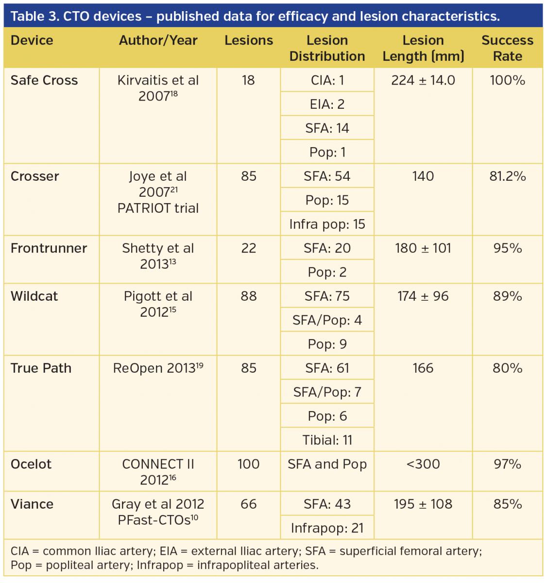 Role of crossing device technology. Failure to cross into the true distal lumen is the most common reason for procedural failure in the context of CTO revascularization.2,11 CTO recanalization has traditionally been achieved with the use of a support catheter technique and wire (often with a weighted and/or hydrophilic tip) with either negotiation of the true lumen or subintimal passage and reentry.12 Given the challenges associated with reentry in the smaller BTK vessels and risk of damage to run-off vessels, dedicated crossing technologies are being developed to maintain true lumen position during recanalization. In theory, devices that facilitate true lumen crossing have several advantages over traditional methods, including reductions in procedural and radiation exposure times, as well as reduced risk of vessel damage. These devices may also result in a more attractive substrate for atherectomy. These potential benefits remain to be tested and are uncertain, largely due to a lack of randomized controlled data.