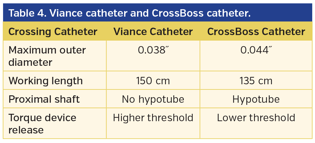 The Viance and CrossBoss catheters were developed by Bridgepoint Medical, Inc. Both catheters employ a similar technique for CTO recanalization. This involves a fast manual torque maneuver with minimal forward pressure to either probe and penetrate the CTO cap/lumen or alternatively enter into the subintimal space in a controlled fashion. The CrossBoss catheter is designed for coronary CTO recanalization and the Viance catheter is indicated for peripheral CTO therapy. The differences between these two catheters are highlighted in Table 4. The Viance catheter was acquired by Covidien in January 2012 and was later approved by the US Food and Drug administration for peripheral vascular use.9 The Viance catheter was first available commercially in September 2012. Prior to the availability of the Viance catheter, the CrossBoss was used off-label in the present study. Boston Scientific has subsequently acquired the CrossBoss catheter for coronary use.