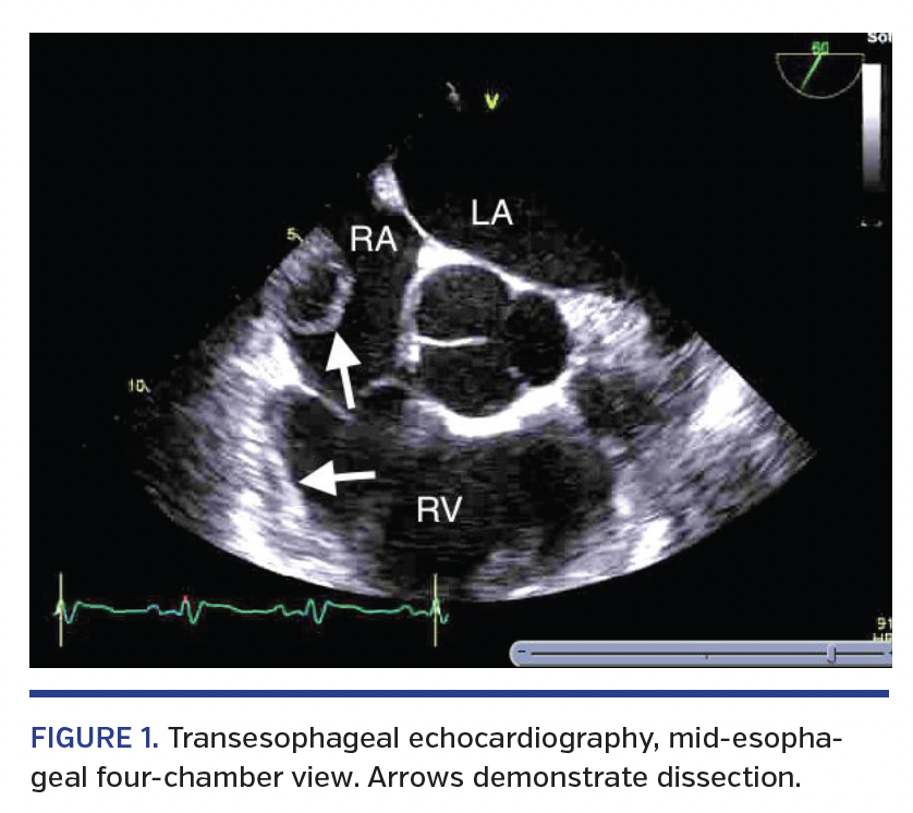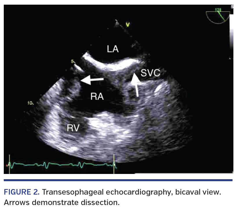A 62-year-old male with an abnormal stress test underwent stent placement of the left anterior descending coronary artery. Soon after, this was complicated by stent thrombosis leading to cardiogenic shock that was refractory to pressors, requiring intra-aortic balloon placement. The patient was eventually weaned off pressors and ventilatory support, but developed septic shock secondary to hospital-acquired pneumonia, and shortly thereafter developed cardiogenic shock. A Swan-Ganz catheter was then placed with the aide of an Arrow Spring-Wire guide (Teleflex), marked 0.035˝ diameter x 17-3/4˝ with an Arrow Advancer (Teleflex). The patient remained hemodynamically stable throughout the procedure. Transesophageal echocardiography was then performed after placement to rule out any cardiogenic abnormalities contributing to the presentation. Results demonstrated a right atrial dissection with extension into the superior vena cava and right ventricle not seen on previous echocardiographic findings (Figures 1 and 2). No intervention was performed as the patient’s hemodynamic status improved. We propose that during Swan-Ganz catheter placement, the guidewire sheared the intimal lining of the superior vena cava and endocardium.