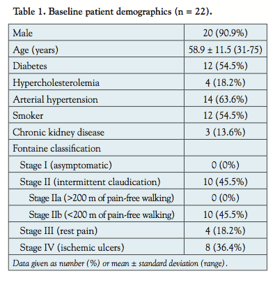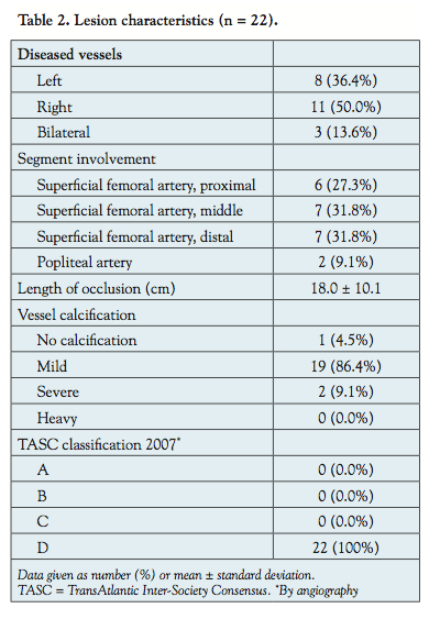 10.1 cm. All lesions were considered complex (TASC D), and 86.4% of the lesions were mildly calcified. Diabetes was present in 12 patients (54.5%) and 14 patients (63.6%) had arterial hypertension. All baseline patient demographics and femoropopliteal lesion characteristics are summarized in Tables 1 and 2, respectively.