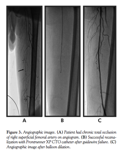The purpose of this study was to determine the safety and efficacy of the Frontrunner XP CTO catheter (FR-XP; Cordis Corporation) for recanalization of CTO of femoropopliteal arteries after guidewire failure. The FR-XP catheter is a blunt microdissection device that takes advantage of the elastic properties of adventitia versus inelastic properties of fibrocalcific plaque to create fracture planes. This technique may be advantageous in penetrating hard fibrous caps and creating a passage through the CTOs.