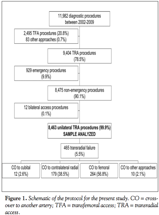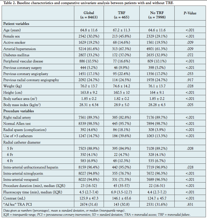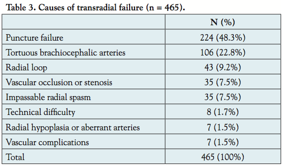 Study limitations. There are limitations to this study; it is a single-center study, and emergent cases (ie, primary angioplasty) were not included. We must acknowledge that some of the variables correlating with an increased risk of TRF were simple correlates of failure, such as procedure time, contrast volume, and fluoroscopy time. Radial spasm was not assessed using more objective measures such as mechanical devices or a more complex spasm score. However, the study protocol reflects the daily practice44 in our catheterization laboratory and the results easily extrapolate to other centers with a high volume of TRA in non-emergent percutaneous coronary diagnosis and intervention.