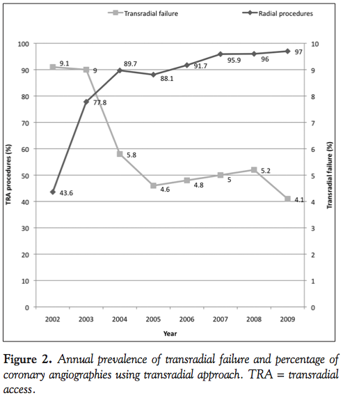 Our data showed that failure and complications associated with TRA in coronary angiography are low, and more importantly, we found that as experience accumulated over time TRF rates went down. The advantageous use of radial access in this unselected population has reduced the procedures performed via femoral access from over 55% in the year 2002 to a mere 3% in 2009.