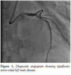 positive myocardial perfusion scan underwent elective coronary angiogram at our institution. There was significant ostial LM disease by angiography (Figure 1) and intravascular ultrasound imaging (IVUS). The best angiographic views were the right and left anterior oblique (RAO and LAO) with a cranial projection. A 6 Fr Judkins 4 guiding catheter was used and a workhorse wire inserted into the left anterior descending artery. Predilatation was done with a 3.0 mm balloon.