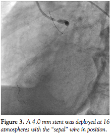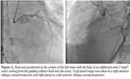 Before delivery of a 4.0 mm LM stent, another workhorse coronary wire was introduced into the guide and curled back into the aorta so that it now looked like the sepal of a flower and the guiding catheter like the flower stalk. The LM stent was then able to be advanced through the guiding catheter into the LM. At this stage, the guiding catheter was manipulated to situate closely to the ostium, but would be prevented from fully intubating into the LM by the “sepal” wire, and a more co-axial position