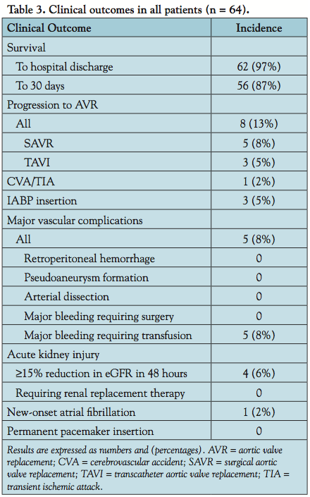 All patients had a retrograde transfemoral approach. Rapid pacing was used in 61 patients (95%). Catheterization laboratory door-to-balloon time was 31.1 ± 12.6 min. There was significant reduction in transaortic PG and significant increase in AVA on echocardiography (P<.001), with significant reduction in peak-to-peak gradient on catheterization (67.4 ± 19.5 mm Hg pre-BAV and 36.0 ± 16.5 mm Hg post-BAV; P<.001), following 1.3 ± 0.8 balloon inflations per patient. After the procedure, manual compression of the access site was applied in 53 patients (83%), with suture-mediated pre-closure in 11 patients (17%). Three patients (5%) required IABP insertion; however, these patients had severe concomitant coronary artery disease and had concurrent coronary PCI. No other forms of LV assist devices were used. Other clinical outcomes are summarized in Table 3. Of particular note, 1 patient (2%) suffered acute ischemic CVA, 4 patients (6%) had acute kidney injury though no patients required renal replacement therapy, and 5 patients (8%) had postprocedural bleeding requiring transfusion. All patients with postprocedural bleeding received manual compression of the access site.