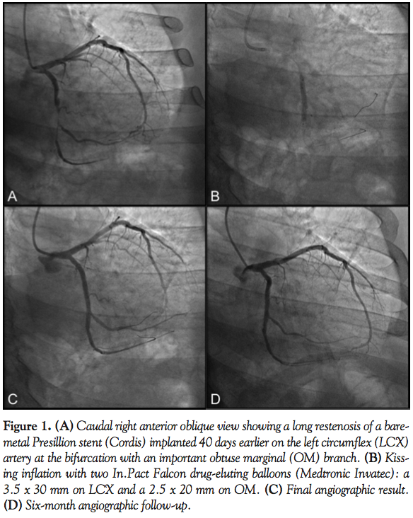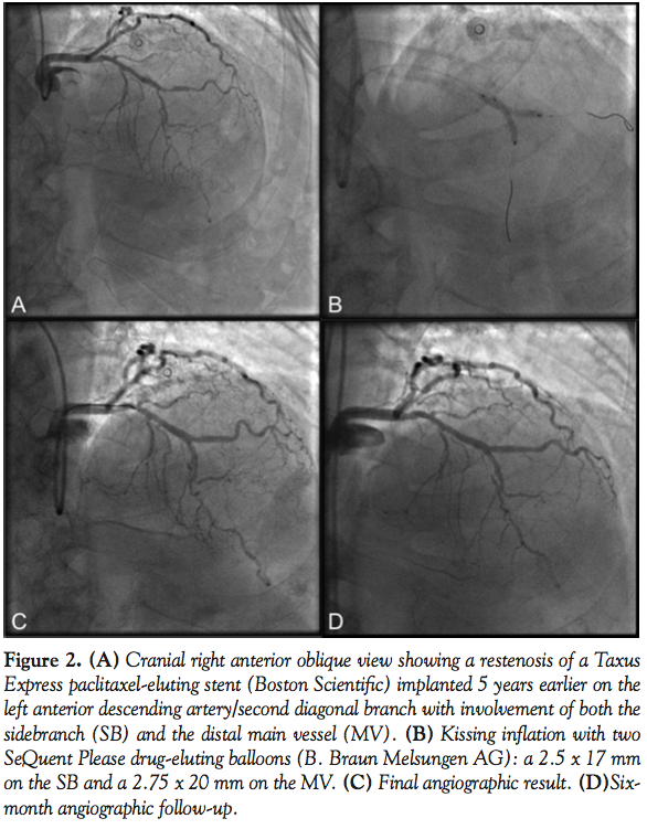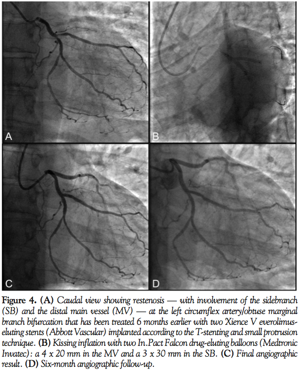 Recently, drug-eluting balloons (DEB) have shown good results in the treatment of both bare-metal stent (BMS) and DES restenosis.2-4 Moreover, several potential benefits are associated with DEB use in bifurcation restenosis, including homogeneous drug transfer to the vessel wall, drug concentration highest at the time of the injury caused by angioplasty, absence of polymer and new metal layer, and respect of the stented bifurcation geometry, provided simultaneous inflation of two DEB (one in the MV and another one in the SB).5 We previously have shown the feasibility of a kissing DEB approach to treat de novo bifurcation lesions.6 In this report, we present four cases of PCI and their angiographic follow-up (FU), selected to illustrate the concept and the advantages of a kissing DEB strategy in the treatment of different kinds of bifurcation restenosis.