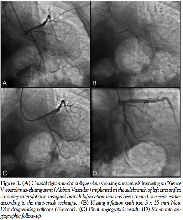 Overall, the kissing-DEB approach appears a very straightforward procedure for the treatment of virtually any kind of bifurcation restenosis.