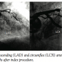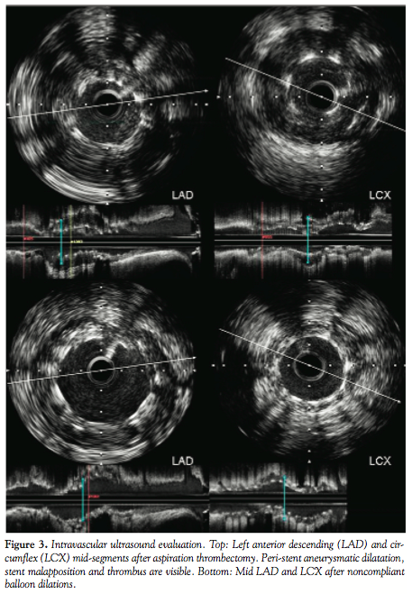 restored (TIMI 2 flow) (Figure 2). IVUS was performed. In the LAD, there was malapposition of the stent, with a large amount of thrombus detected and an image compatible with severe ectasia and a peri-stent coronary aneurysm [aneurysm cross-sectional area (CSA): 27.25 mm2; minimum lumen diameter (MLD): 1.6 mm; distal reference diameter (DR): 2.8 mm; and proximal reference diameter (PR): 3.5 mm]. The remaining vessel had non-significant fibrolipidic plaque and small calcification areas. In the LCX, thrombus was also evident and peri-stent dilation (aneurysm CSA: 20.36 mm2) with stent malapposition (similar to the LAD) was visible (MLD: 1.9 mm; DR: 2.6 mm; and PR: 2.75 mm) (Figure 3).