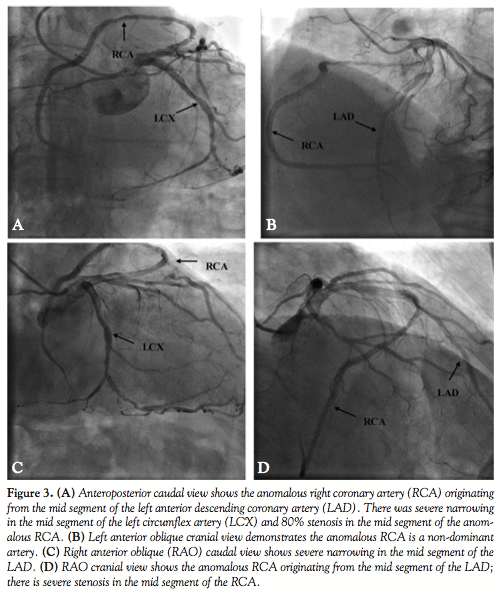 - Xuguang Q, Weiguo X, Chunpeng L. The coronary anomaly: Right coronary artery originates from the mid left anterior descending (LAD) artery. J Invasive Cardiol 2010;22:E166–E167.