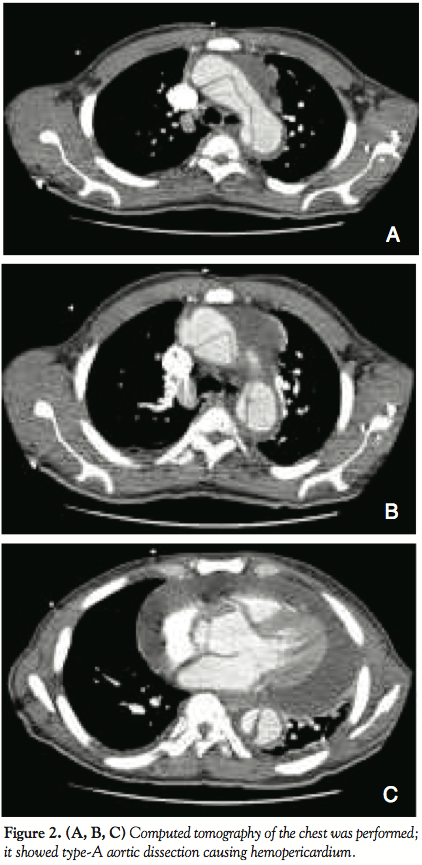 Laboratory work-up showed white cell counts of 7,800 cells/ml with normal differentials, platelets of 234,000/ml and hemoglobin of 9.4 mg/dl. Basic metabolic panel was unremarkable. Chest x-ray was done and showed enlarged heart size with obscured left lower lobe with superimposed density effusion (Figure 1). Computed tomography of the chest was performed and showed type-A aortic dissection causing hemopericardium (Figure 2). The cardiothoracic surgery team was consulted and the patient was immediately taken for emergency operation. The patient underwent surgery and experienced a successful outcome.