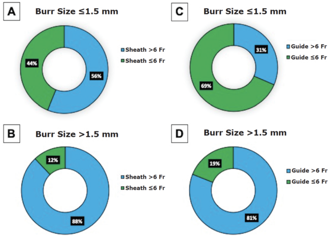 Importantly, our study highlights the “overuse” of large sheaths and guide catheters to deliver small burrs. In fact, 56% of the patients had a sheath >6 Fr and 31% had a guide catheter >6 Fr when a burr ≤1.5 mm was utilized. In this regard, one may think that certain operators have chosen a larger guide catheter to obtain more support, yet there is still a 25% incongruence between a large sheath inserted (ie, 7 Fr) and a smaller guide catheter used (ie, 6 Fr) (Figure 2). Moreover, a 1.75 mm burr was used in 84% of the cases among the large-burr group, when this burr size can be accommodated in a 6 Fr guide catheter (albeit with some friction).10 Furthermore, the burr size in the large-burr group was chosen according to the operator preference and not due to failure to cross or complete the procedure with a burr ≤1.5 mm, suggesting therefore that even a higher proportion of the procedures could have been completed using small-sized burrs. As a matter of fact, if a 6 Fr system would have been utilized in all of these patients, only 8 (3.6%) would have truly needed larger guide catheters to accommodate the larger burrs used. Hence, considering that plaque modification can easily be achieved with smaller burrs, a 6 Fr system used for conventional PCI should not represent a problem for RA, and moreover, would have increased the chances of using the radial approach.11,12