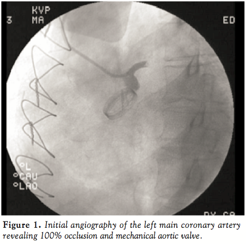 The incidence of acute ST-elevation myocardial infarction (STEMI) secondary to occlusion of the left main coronary artery (LMCA) is rare with rates ranging from 0.8 to 1.7% of all STEMI cases.1 The optimal management of patients presenting with left main thrombosis is unclear based on the current literature. Most patients present in cardiogenic shock, which, in itself portends a grave prognosis, and is usually fatal without emergent revascularization. Unfortunately, revascularization either by emergency coronary artery bypass surgery or primary percutaneous coronary intervention (PCI) in the setting of acute myocardial infarction and cardiogenic shock are associated with mortality rates as high as 50%.2 Although plaque rupture and subsequent thrombosis represent the mechanism for infarction in the majority of STEMI patients, embolism to the LMCA has been previously described. We present a case of left main thrombosis and cardiogenic shock in a patient with a prosthetic mechanical aortic valve, subtherapeutic INR, and otherwise angiographically normal coronary arteries — suggesting an embolic etiology. The acute interventional management and review of literature of left main thrombosis is described.