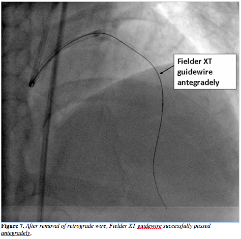 negotiated (Figure 2). The procedure was eventually abandoned. An ipsilateral intraseptal collateral channel was comparatively straight for better accommodation of the retrograde wiring. A second attempt using retrograde approach was thus made after 2 months. A 7 Fr Launcher 3.5 guide catheter (Medtronic, Inc) was engaged in the left coronary artery and a Fielder FC 300 cm guidewire (Asahi Intecc) was introduced in the proximal septal branch and navigated into the distal LAD through the distal septal branch via intraseptal collateral (Figure 3). Because of its favorable angulation and low tortuosity, wire manipulation in the distal LAD was relatively smooth. The retrograde guide catheter was cut short for longer distance to the lesion.