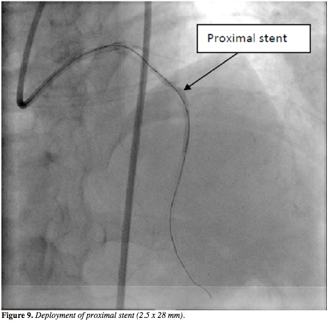 was then advanced through the subintimal dissection into the proximal LAD (Figure 6) and then the Corsair was advanced over this wire proximal to the CTO segment. As a result, the true lumen of the distal LAD was then successfully negotiated with a Fielder XT guidewire in an antegrade fashion (Figure 7). The retrograde wire with Corsair was removed. After successful balloon dilatation, two Yukon stents (Translumina) of 2.5 x 32 mm and 2.5 x 28 mm were deployed (Figures 8 and 9), with an optimal angiographic result (Figure 10 and Video 2). The patient is free of symptoms after 6 months of follow-up.