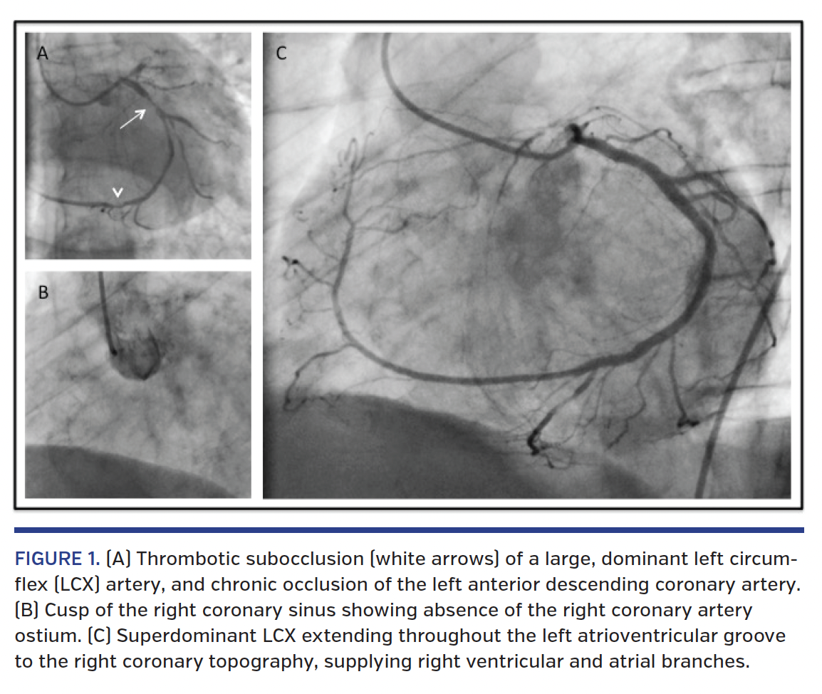 Coronary angiography showed a large, dominant left circumflex (LCX) artery with subocclusive thrombus burden (Figure 1A). The left anterior descending (LAD) artery was chronically occluded in the proximal segment, and the right coronary artery ostium was absent despite several attempts to locate it at the right coronary sinus and at different sites of possible anatomic variations (Figure 1B). Primary percutaneous coronary intervention (PCI) was successfully performed in the proximal and mid segments of the LCX with two drug-eluting stents. After restoration of normal flow, angiography clarified a superdominant LCX with extended course through the left atrioventricular groove and right coronary topography, supplying the right ventricular and atrial branches (Figure 1C). Intracoronary collaterals to the distal LAD were noted arising from the distal LCX. The patient recovered well after the procedure without major complications, but developed severe left ventricular dysfunction with an ejection fraction of 26% by transthoracic echocardiogram.