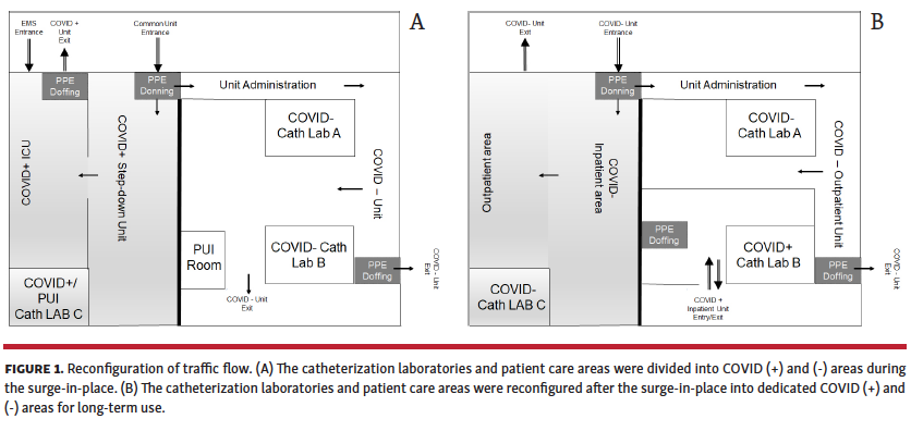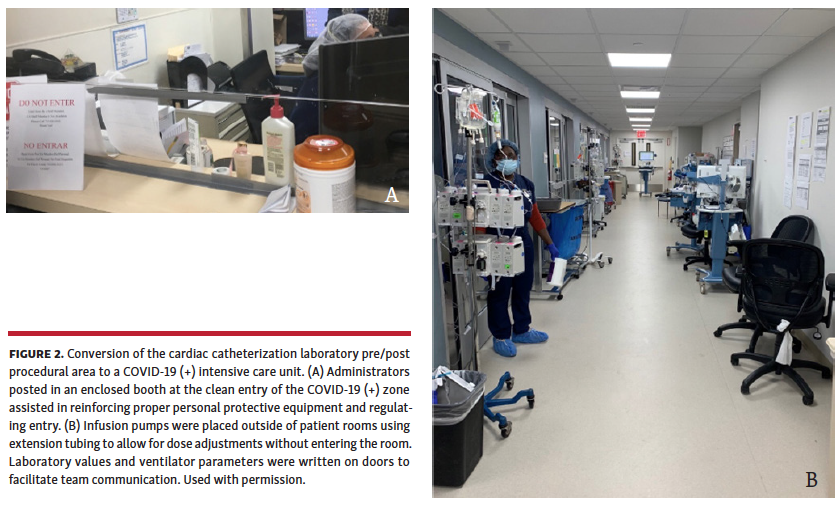 In December 2019, a viral pneumonia of unknown etiology was described in Wuhan, China.1-3 The cause was identified as a novel severe acute respiratory syndrome coronavirus 2 (SARS-CoV-2) on January 3, 2020 and by March it had become a pandemic.1-3 The number of confirmed SARS-CoV-2 cases in New York State exponentially increased in early Spring 2020 to nearly 84,000, with over 41,000 of these in New York City (NYC) alone.4 An executive order was issued on March 23, 2020 mandating all hospitals to increase in-hospital bed capability by 50%.5 The borough of Bronx, New York was highly affected by coronavirus disease-2019 (COVID-19).6,7 Population density, socioeconomic disadvantage, poor health status, a large number of essential workers, and frequent public transportation usage contributed to cases in the borough.7-10 COVID-19 cases are once again surging across the Northeastern and Midwestern United States, and there is a second wave across Europe. Practical information on how hospitals successfully dealt with the first surge-in-place is of great importance in combating the current crisis. We provide our experience converting our cardiac catheterization laboratory (CCL) patient care areas into COVID-19 intensive care units (ICUs). Adapting cardiac cath lab patient care areas for COVID-19 care is a model that could be rapidly employed in the current pandemic.