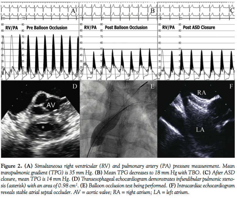 TBO can also be useful in the evaluation of suitability for closure of an ASD in patients with congenital lesions. Patients with hypoplastic right heart may be intolerant to ASD closure due to inability to accommodate systemic venous return.9,10 Pulmonic stenosis also presents a diagnostic dilemma due to underestimation of the valvular area due to increased flow from the interatrial shunt. The question as to whether or not the valve lesion is severe enough to warrant surgical correction cannot formally be assessed until after ASD occlusion.2 The second case highlights the importance of further evaluation of ASD closure in patients with concomitant pulmonary stenosis. The increased flow throughout the pulmonary valve due to an ASD may overestimate the valvular gradient. TBO allows adequate assessment of the resultant gradient to determine if any additional intervention to the pulmonary valve is indicated. In our case, the patient had an infundibular stenosis, which would have prompted a surgical correction had the gradient remained significantly elevated following TBO.