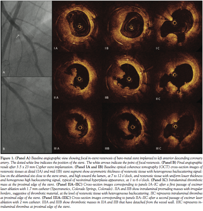 (Figure 1, Panel A). Optical coherence tomography (OCT) (ImageWire and Imaging System M2, LightLab Imaging, Westford, Massachusetts) was performed using a non-occlusive technique with automated pump injection of iso-osmolar contrast (Visipaque, GE Healthcare, Cork, Ireland) with a pullback speed of 2 mm/second, after intracoronary administration of 400 µg nitroglycerin and intravenous injection of 5,000 IU heparin. The stent was imaged for its entire length. OCT showed restenotic tissue with asymmetric thickness and heterogenous backscattering signal: low on the abluminal site close to the stent struts, and high toward the lumen, at 7 to 12 o’clock, from mid to proximal stent segment, with a minimal luminal area of 2.6 mm2 (Figure 1, Panels IA and IB). At 1 to 6 o’clock, the restenotic tissue showed a uniform lower thickness with homogenous high backscattering signal, typical of neointimal hyperplasia (Figure 1, Panels IA and IB). At the proximal stent edge, an intraluminal protruding thrombotic mass was detected (Figure 1, Panel C). The decision to perform laser angioplasty was made, and an additional bolus of 4,000 IU of intravenous heparin were administered. After excimer laser ablation with a 1.7 mm catheter (Vitesse 1.7, Spectranetics, Colorado Springs, Colorado), the heterogeneous restenotic tissue fragmented into irregular masses protruding into the lumen, highly suggestive of thrombotic material (Panels IIA and IIB). After laser ablation with a 2.0 mm catheter, the thrombotic masses detached from the vessel wall, causing further lumen narrowing (Figure 1, Panels IIIA and IIIB). Post-dilatation of the stent with a 2.5 x 10 mm Maverick balloon (Boston Scientific, Natick, Massachusetts) and implantation of a sirolimus-eluting Cypher stent (Cordis Corporation, Miami, Florida) 3.5 x 23 mm were performed, with optimal angiographic result (Figure 1, Panel B). The patient was discharged home with the indication to continue life-long aspirin at a dosage of 100 mg daily and clopidogrel for 12 months at a dosage of 75 mg daily.