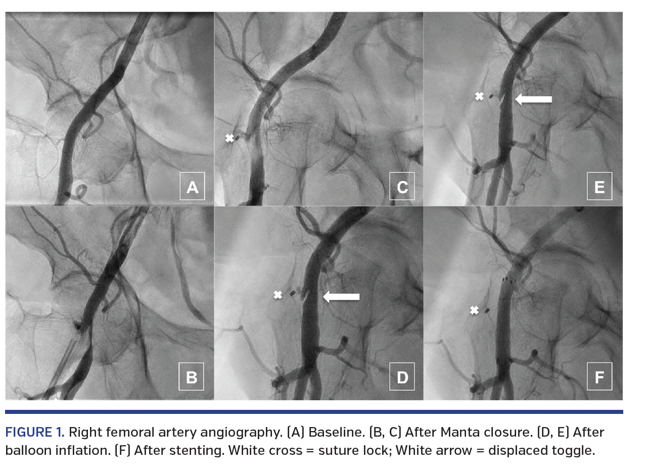 A 73-year-old woman with severe aortic stenosis was scheduled for transcatheter aortic valve replacement through the right femoral artery (Figure 1A). Fluoroscopic-guided femoral cannulation was achieved and a 26 mm Evolut Pro valve (Medtronic) was successfully implanted. Femoral closure was intended with the new collagen-based 14 Fr Manta device (Essential Medical). After apparent successful closure, control angiography showed mobile subocclusive intravascular material protruding from the anterior puncture site to the posterior calcified wall (Figures 1B and 1C; Video 1). Moreover, the stainless-steel suture lock appeared to be distant from the vascular wall. After sealing with a 7 mm balloon inflation, repeat angiography showed the resorbable polymer intra-arterial toggle embedded against flow and protruding into the lumen (Figures 1D and 1E; Video 2). A 40 x 8 mm vascular stent-graft was then deployed with optimal result (Figure 1F).