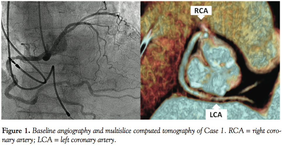 TAVI is a proven treatment for patients with symptomatic aortic stenosis with a high risk for conventional surgery.1 The incidence of anomalous coronary arteries in this patient population remains unknown. From retrospective angiographic studies, a single coronary artery is seen in less than 0.05%, usually a left coronary artery originating from the right sinus of Valsalva.2 This anatomical variant is relevant to TAVI, particularly because coronary obstruction occurs in ~1% of procedures3 and acute coronary obstruction in patients with anomalous coronary artery origin is even more complex. Little is known about the feasibility of TAVI in cases of a single coronary artery. We report two such cases: one patient treated with the Edwards SAPIEN XT valve (Edwards Lifesciences) and another treated with the CoreValve Accutrak device (Medtronic). We discuss the screening tests used to anticipate the risk of coronary obstruction.