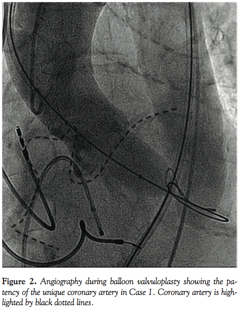 During the procedure, predilation of the aortic orifice with a 22 mm balloon with simultaneous aortography confirmed the patency of the unique coronary artery at maximum balloon inflation prior to the successful delivery of a 26 mm Medtronic CoreValve Accutrak prosthesis without any significant leakage.