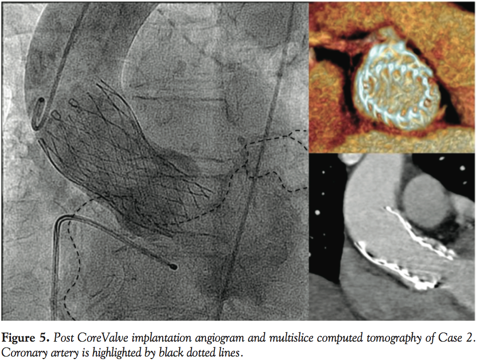 MSCT performed on day 2 demonstrated the correct position of the CoreValve, 4 mm below the aortic annulus, with a patent coronary artery (Figure 5).