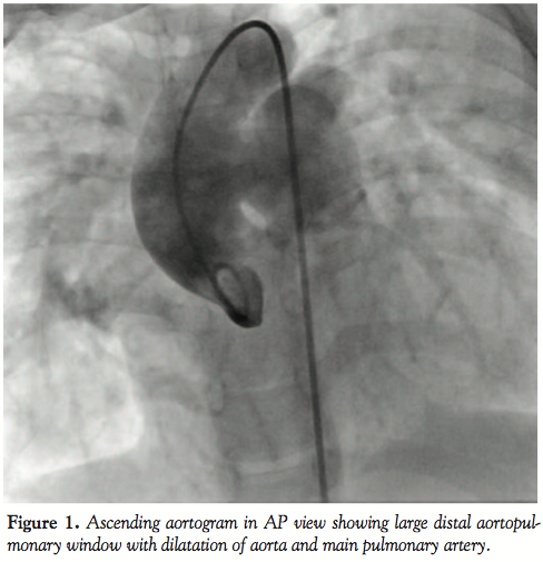 The first report of an aortopulmonary window was that of Elliotson in 1830.1 APW refers to a communication between the main pulmonary artery and the ascending aorta with separate semilunar valves and accounts for 0.1%-0.2% of all congenital heart defects. Mori et al2 classified aortopulmonary connection into 3 types.