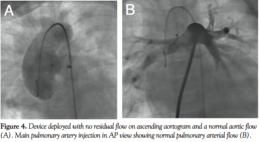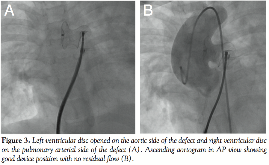The child was taken up for assessment of PVR and device closure of the APW. The femoral artery and vein were percutaneously cannulated. Unfractionated heparin (100 units/kg) was administered after vascular access was obtained. There was a 20% increase in saturation at the left pulmonary arterial level compared to superior vena cava. She had high pulmonary artery pressures (76/44 mmHg, mean=55 mmHg, 2/3 of systemic pressures), Qp/Qs was 3.5:1 and PVRI was 6·1 Wood units·m2. Ascending aortography demonstrated a large distal APW measuring 14 mm. As the defect was about 6 mm away from coronary ostium, using an atrial septal occluder (which has a 7 mm rim) could have compromised the coronary opening so we decided to use a muscular VSD device. The defect was crossed antegradely from pulmonary artery and an extra stiff Amplatz (360 cm) wire (Cook Medical) was placed in the descending aorta. A 9 Fr long sheath (Cook) was tracked over the wire, across the APW, and was lodged into the descending aorta. An 18 mm muscular VSD device (ShenZhen) was introduced into the long sheath and the distal (left ventricular) disc was opened in the aorta. The device was then retracted towards the defect, and the proximal (right ventricular) disc was opened on the pulmonary arterial side of the defect. The mean PA pressure dropped to 36 mmHg. Appropriate device position was confirmed both by transthoracic echocardiography and angiograms in multiple views. There was no residual flow across and no obstruction to either aortic or pulmonary arterial flow. She was put on oral aspirin for 6 months and her 1-year follow-up showed improved physical growth, no obstruction to aortic or pulmonary arterial flow, and near normalization of PA pressures on 2D echocardiogram.