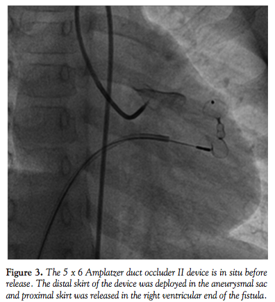 An arterio-venous loop was made, and a 6 Fr shuttle delivery sheath (Cook Medical) was advanced over this wire from the venous end. However, the sheath could not be negotiated into the fistula from the right ventricular end (Figure 2). Hence, through the same delivery sheath, a 5 Fr right Judkin’s guiding catheter was introduced into the fistula. A 5 x 6 ADO II device was loaded and then advanced into the Judkin’s catheter and the distal skirt of the device was deployed in the aneurysmal part of the fistula.