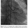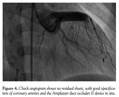 The guiding catheter was then withdrawn up to the right ventricular aspect of the fistula and the proximal retention skirt was released in the right ventricular end of the fistula (Figure 3). Repeat angiogram showed good position of the device with no residual shunt and better opacification of the coronary arteries (Figure 4). No complication occurred during or after the procedure. Electrocardiogram showed no changes. The patient was put on aspirin 5 mg/kg/day for 3 months. She was examined after 3 and 12 months and was asymptomatic with no murmur on clinical examination, and no residual shunt on echocardiogram.