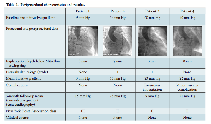 All 4 patients were alive at 3 months, and no patient was lost to follow-up. All patients reported clinical improvement and symptom relief. According to New York Heart Association classification, 1 patient improved from class IV to III and the other 3 patients improved from class III to II. There were no signs of hemolysis. Echocardiography showed mildly elevated mean transvalvular gradients in 2 patients. No other adverse events were reported during follow-up.