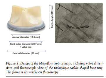 Special aspects of the Mitroflow bioprosthesis. The Mitroflow bioprosthesis is a stented valve with a silicone base ring, an acetyl homopolymer stent, and leaflets manufactured from bovine pericardium. The fluoroscopic marker is located within the sewing ring at the base of the frame. A unique feature of the valve design is the fact that the leaflet tissue is mounted on the exterior side of the valve frame in order to maximize the effective orifice area. However, this also results in a higher potential risk of coronary obstruction during ViV-TAVI. The Mitroflow valve frame itself is not visible on