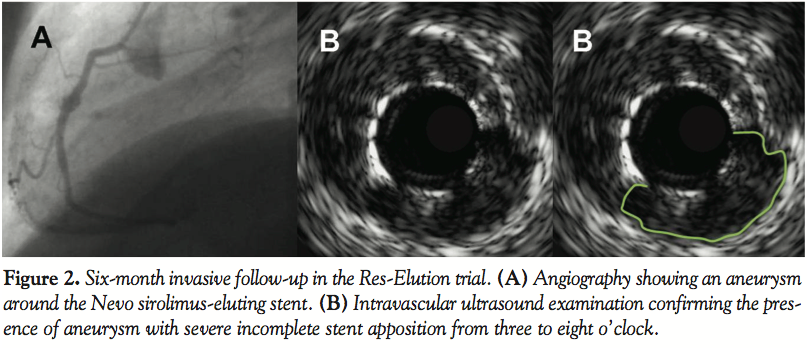 Our case indicates a possible relationship between polymer and safety. Polymers have been hypothesized to cause inflammation related to hypersensitivity reactions with chronic eosinophillic infiltration of the arterial wall and delayed healing and increased risk of stent thrombosis, although none of the patients with aneurysm formation in the Cypher pivotal trials had stent thrombosis (Christian Spaulding, personal communication, data on file at Cordis corporation). The chemical structure and location of the polymers in the Cypher and Nevo stent differ. The Cypher coating is a mixture of two durable polymers, poly(n-butyl)methacrylate (PBMA) and poly(ethylene-co-vinyl acetate) (PEVA) and sirolimus, which are on the surface of the stent. The Nevo polymer is incorporated in the reservoirs of the stent and the bioresorbable polymer poly(DL-lactic-co-glycolic acid).