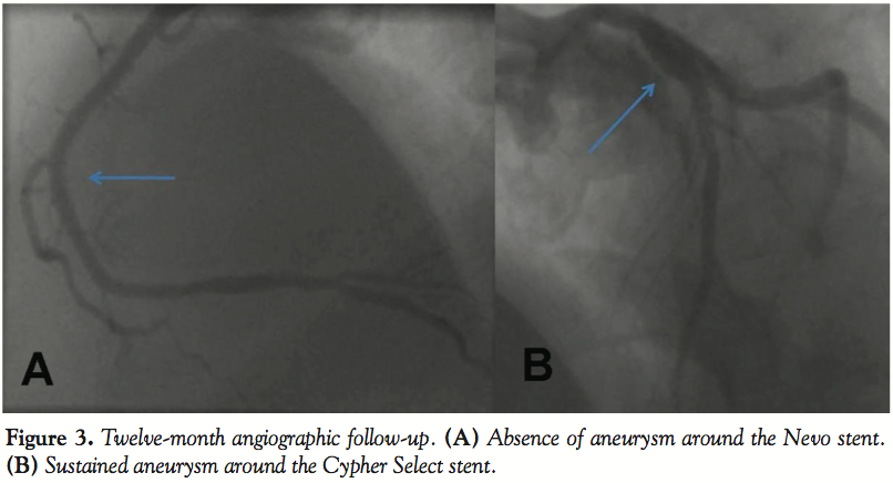 In conclusion, our report of coronary aneurysm development and subsequent healing after implantation of the sirolimus-eluting absorbable polymer Nevo stent, contrasted to demonstration of a persistent aneurysm after Cypher stent implantation in the same patient, suggests a favorable long-term safety profile for the Nevo stent.