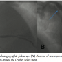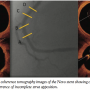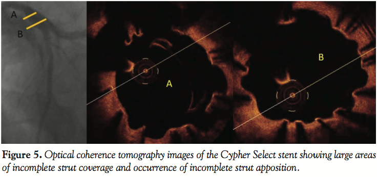 (Figures 3A and 3B) and OCT showed complete healing of the aneurysm related to the Nevo stent (Figure 4), while there was a persisting aneurysm with relation to the Cypher stent (Figure 5). The patient remained asymptomatic after the primary PCI procedure and was on continuous dual-antiplatelet medication.