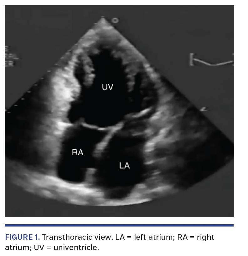 An 18-year-old male patient with an unknown past medical history presented to the emergency room with complaints of palpitations and paroxysmal episodes of shortness of breath over a 7-year period. The patient was from Uruguay and visiting the United States when symptoms occurred. He had been told in the past that he had a heart defect, but was never treated surgically or medically. On physical examination, the patient was slightly tachycardic with a systolic murmur noted adjacent on the left fourth intercostal space. Crackles were noted in the lower lung fields bilaterally. The patient looked adequately nourished with average build, along with grade 1 clubbing of his digits. Blood pressure was 100/64 mm Hg with a heart rate around 120 beats/min, saturating around 95% on room air. His dyspnea improved with supplemental oxygen over several minutes. Electrocardiogram demonstrated atrial flutter. Chest x-ray showed moderate pleural effusions bilaterally with a smaller-than-expected heart. Transthoracic echocardiography displayed a univentricle with an ejection fraction of approximately 45% (Figure 1 and Video 1). No other cardiac pathologies were noted. Cardiac catheterization and surgical interventional options were presented to the patient, but he refused and was lost to follow-up.