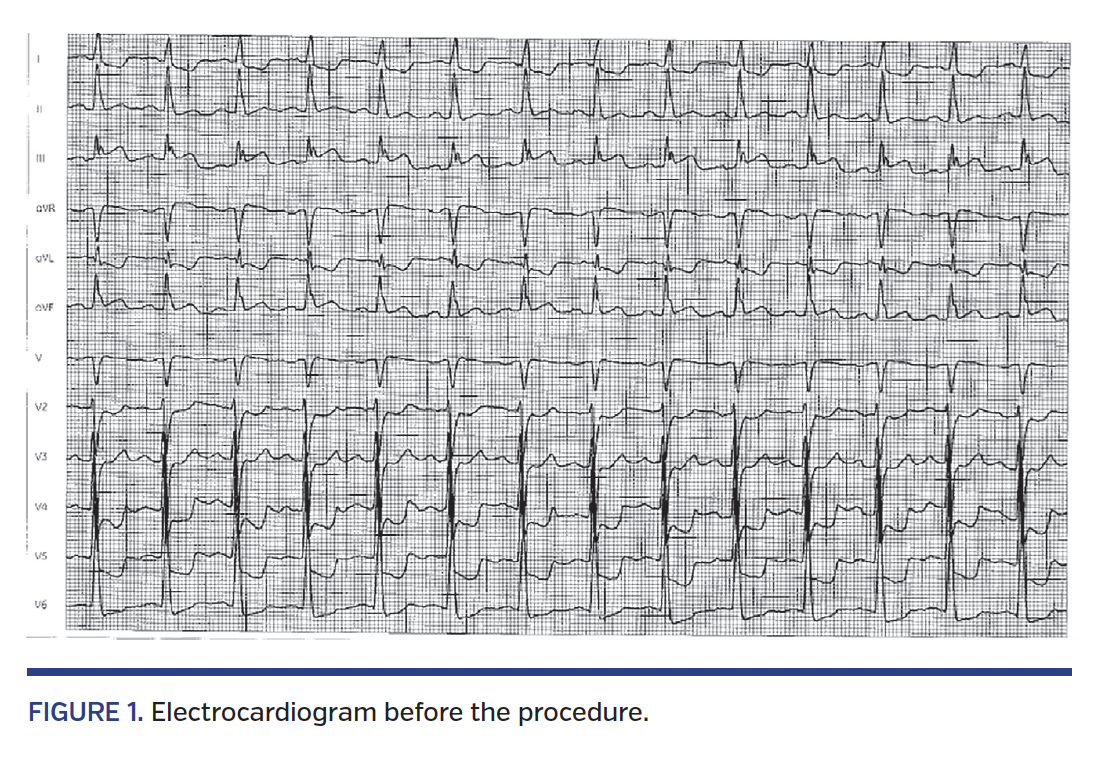 At admission, troponin I was 0.06 µg/L (increasing to 245 µg/L 6 hours after the procedure), white blood cell count was 10.6 g/L with neutrophilia 8 g/L, and C-reactive protein was 107.1 mg/L. Serum electrolytes, urea, creatinine liver enzymes and clotting times were normal.
